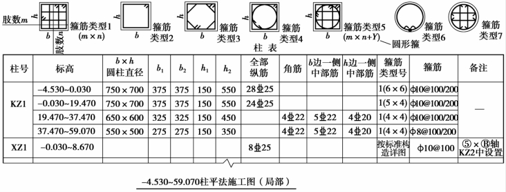 具体工程所设计的各种箍筋类型图以及箍筋复合的具体方式,需画在表的上部或图中的适当位置,并在其上标注与表中相应的b、h和类型号。(注:确定箍筋肢数时要满足对柱纵筋“隔一拉一”以及箍筋肢距的要求。“隔一拉一”的意思是:相邻两根箍筋的垂直肢之间最多只允许有一根柱纵筋不被箍筋拉住。)