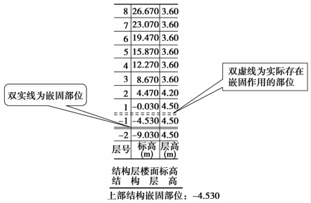 ②框架柱嵌固部位不在基础顶面时,在层高表嵌固部位标高下使用双细线注明,并在层高表下注明上部结构嵌固部位标高。