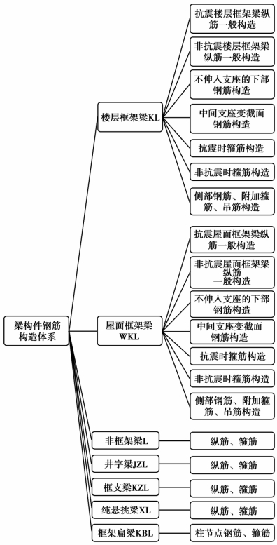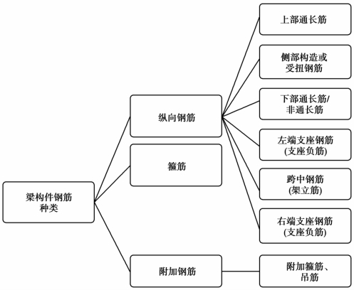 按梁构件组成、梁钢筋组成的思路,可将梁构件钢筋知识体系总结为图3.12所示的内容。