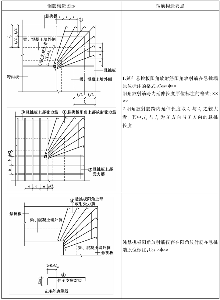 表4.13 悬挑板阳角放射筋Ces构造(16G101—1第112页)