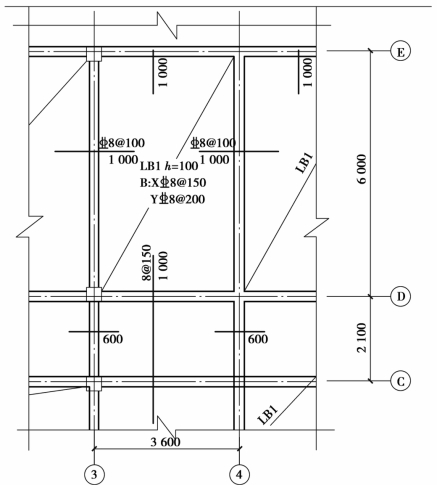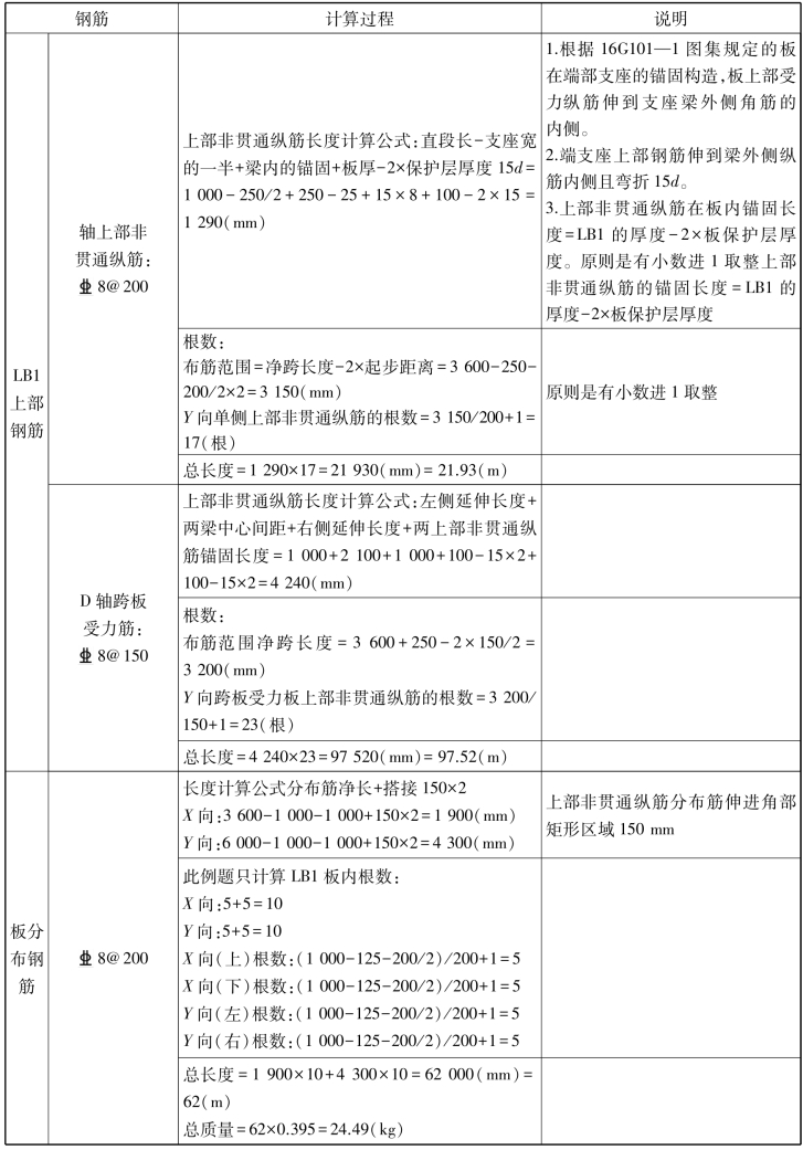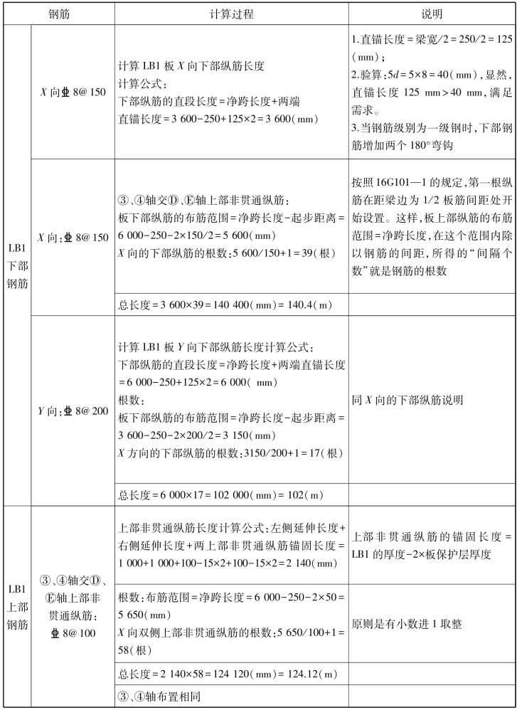②板钢筋计算过程:板平面配筋图③轴~④轴交Ⓓ轴~Ⓔ轴LB1钢筋工程量计算过程见表4.19。
