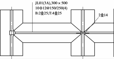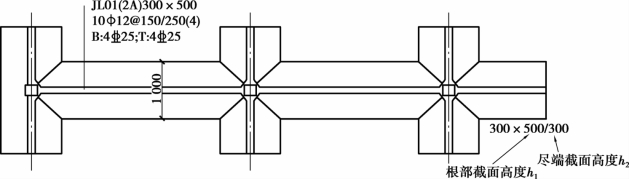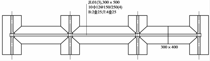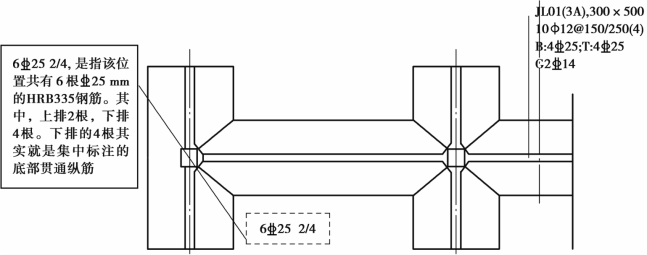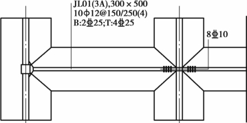 当在基础梁上集中标注的内容不适用于某跨或某外伸部位时,将其修正内容原位标注在该跨或该外伸部位,见图6.17,JL01集中标注的截面尺寸为300×500,第3跨原位标注为300×400,表示第3跨发生了截面变化。