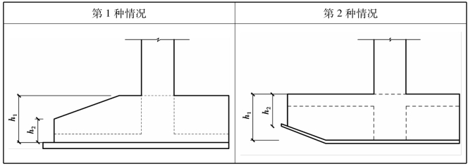 基础梁外伸部位变截面尽端高度值有两种情况(表6.9)。实际施工图中,应绘制相应的剖面图,以表达清楚是哪种情况。