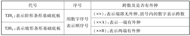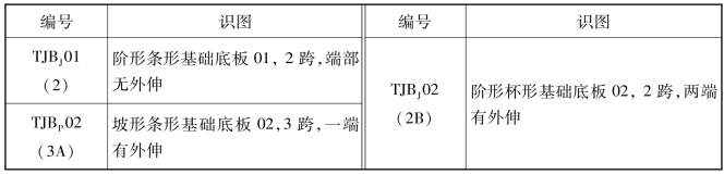 条形基础底板的代号由大写字母“TJB”表示,另加下标“J”和“P”以区别阶形和坡形条形基础底板(表6.12)。