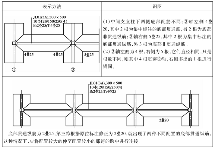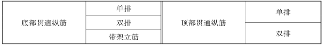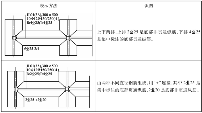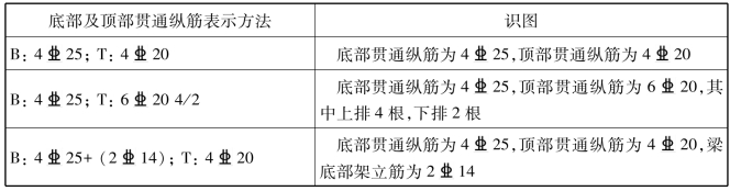 b.底部及顶部贯通纵筋:基础梁底部及顶部贯通纵筋的区别见表6.6。底部贯通纵筋根据需要,多一种带架立筋的表示方法。