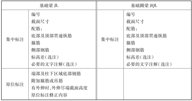 基础圈梁JQL和基础梁JL的平法标注方法是相同的,只是基础圈梁没有原位标注(表6.10)。