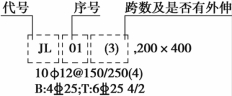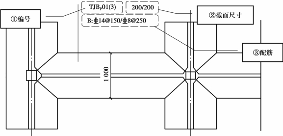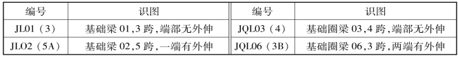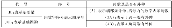 a.基础梁编号表示方法。基础梁集中标注第一项必注的内容是基础梁编号,由代号、序号、跨数及是否有外伸3项组成(图6.4),具体表示方法见表6.3。