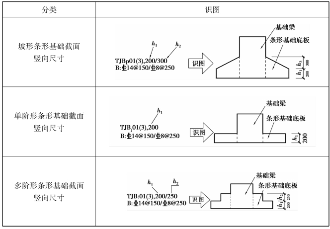 条形基础底板截面竖向尺寸用h1,h2,…自下而上进行标注(表6.14)。