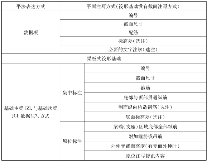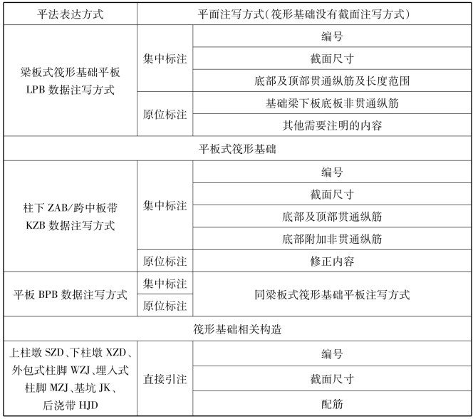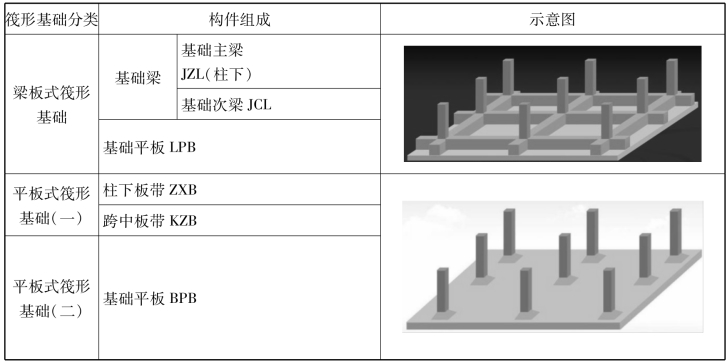 筏形基础分为梁板式筏形基础和平板式筏形基础。梁板式筏形基础由基础主梁、基础次梁和基础平板组成;平板式筏形基础有两种组成形式:一是由柱下板带、跨中板带组成;二是不分板带,直接由基础平板组成。筏形基础的分类及构成见表7.1。