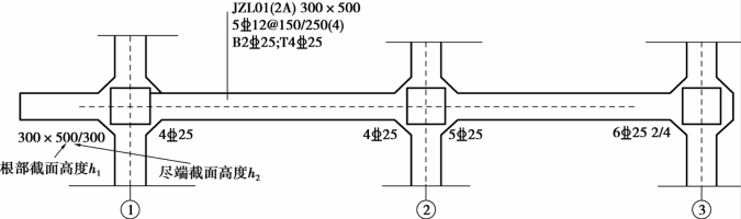 基础主/次梁外伸部位如果有变截面,变截面高度尺寸在外伸端原位标注,标注方式为b×h1/h2(图7.10)。