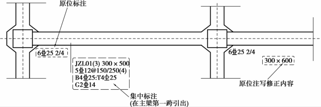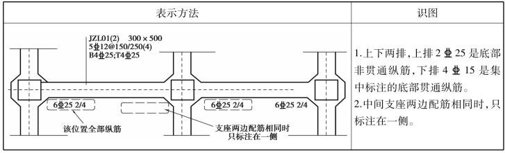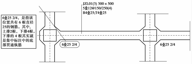 基础主/次梁端(支座)区域底部全部纵筋,是指标注该位置的所有纵筋,包括集中标注的底部贯通纵筋(图7.7)。要理解原位标注的纵筋与集中标注的纵筋的关系。