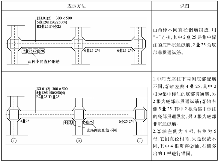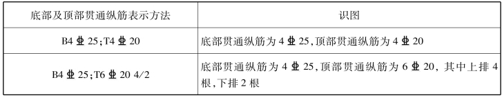 基础主/次梁底部以字母“B”打头,顶部贯通纵筋以字母“T”打头,具体表示方法的平法识图见表7.6。