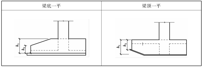 基础主/次梁外伸部位变截面尽端高度值有两种情况(表7.10),实际施工图中,应绘制相应的剖面图,以表达出是哪种情况。