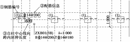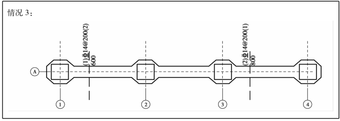 ②原位标注在配置相同的若干跨的第一跨下注写。在配置相同的若干跨的第一跨,水平垂直穿过基础梁,绘制一段中粗虚线代表底部附加非贯通筋,见图7.13。