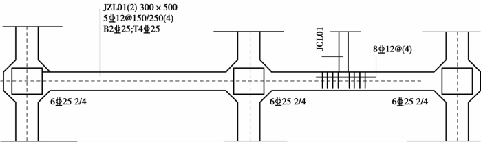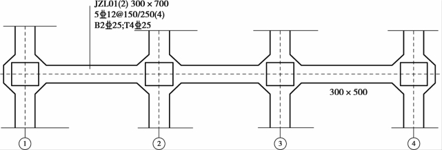 当在基础梁上集中标注的内容不适用于某跨或某外伸部位时,将其修正内容原位标注在该跨或该外伸部位(图7.11)。图中JZL01集中标注的截面尺寸为300mm×700mm,第3跨原位标注为300mm×500mm,表示第3跨发生了截面变化。