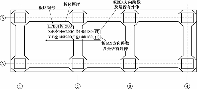 筏基平板集中标注包括板区编号、厚度、配筋、两向跨数及是否有外伸,见图7.14。