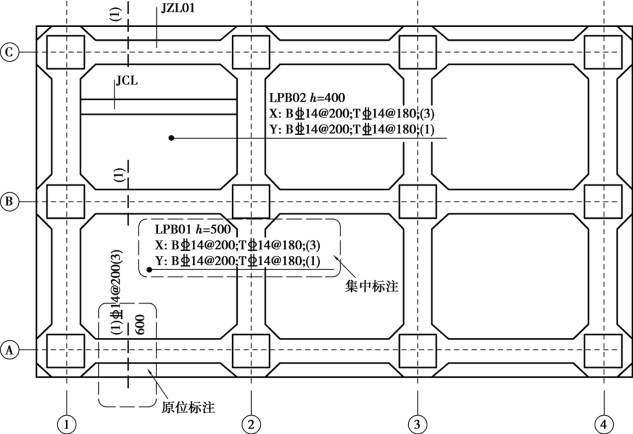 梁板式筏形基础平板LPB的平面注写,分板底部及顶部贯通纵筋的集中标注与板底附加非贯通纵筋的原位标注。当仅设贯通纵筋而未设置附加非贯通纵筋时,则仅集中标注。