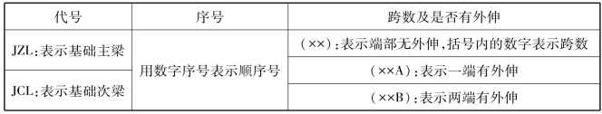 基础梁集中标注的第一项必注内容是基础梁编号,由代号、序号、跨数及是否有外伸3项组成(图7.4),具体表示方法见表7.3。