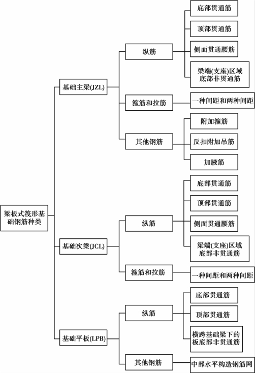 梁板式筏形基础包含基础主梁(JL)、基础次梁(JCL)以及基础平板(LPB)三大构件,它们各自包含的钢筋种类见图7.18。
