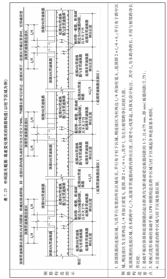 ①梁板式筏形基础的基础平板(LPB)的钢筋一般构造要点见表7.25、表7.26。