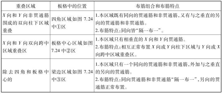 底部纵筋的连接区域,在本跨跨中ln/3,不受柱下和跨中区域影响,但钢筋的组合却受影响。以一个板格为例:图7.24所示正中这4根梁所围成的板格,底部钢筋的组合和布筋特点见表7.24。