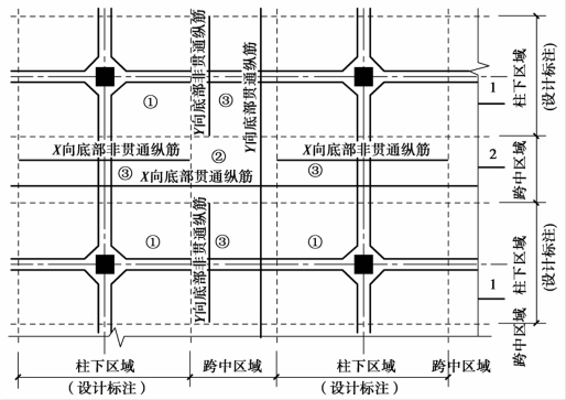 柱下区域:单排X向或Y向底部非贯通筋延伸至跨内的全部非贯通筋长度范围所围成的区域,区域宽度取决于设计标注的非贯通筋长度。