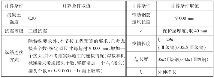 上节介绍了梁板式筏形基础各类构件(JL、JCL、LPB)的平法钢筋构造,本节就这些构件的实际平法标注和钢筋构造情况举例计算。本节所有构件计算的条件及参数,见表7.28。