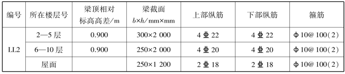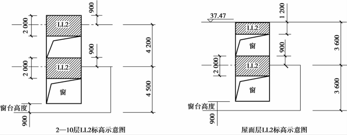 2—10层,LL2高出本层结构标高的高差为0.9m,正好是窗台的高度,LL2正好位于上下两层楼的窗与窗之间。梁表中屋面层梁顶相对标高高差为0,表示连梁顶标高与结构标高相同。