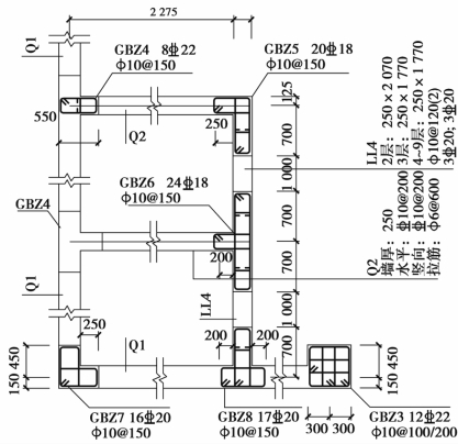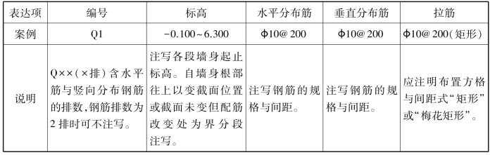 墙身编号,由墙身代号、序号以及墙身所配置的水平与竖向分布钢筋的排数组成,其中,钢筋排数注写在括号内。剪力墙平法施工中图表达形式为Q××(×排),在剪力墙身表中表达的内容见表8.5。