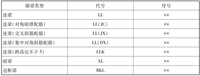 墙梁编号由墙梁类型代号和序号组成,见表8.6。