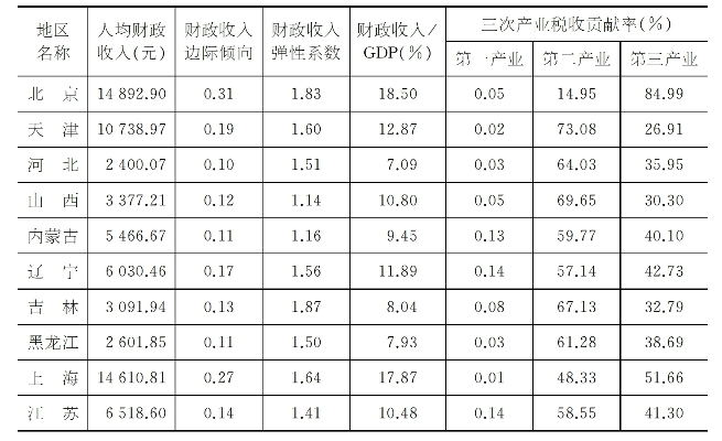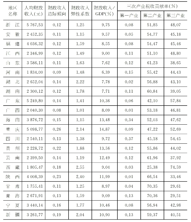 从表3.1我们可以看出,2011年各地人均财政收入差异较大,最少的甘肃只有1 755.41元,而最多的北京为14 892.9元,后者是前者的8倍多。财政收入边际倾向表明每增加单位GDP引起财政收入增加的数额,财政收入弹性系数表明GDP每增长1%所导致的财政收入增长率,这两个指标是调节财政收入规模的关键。2011年,财政收入边际倾向最大的是北京,超过0.3,最小的是广西,只有0.08。财政收入弹性系数最大的是西藏和陕西,这两个地区财政收入增长率是GDP增长率的2倍多,最小的是广西,该省的财政收入增长率仅为GDP增长率的1.01。财政收入占GDP比重是衡量一国财政收入规模的基本指标,具有正、负两重效应:一方面,它能够反映出各省市区财政收入对经济增长的促进作用,即经济增长对地方财政收入的依赖度,这是其积极效应;另一方面,它也是各地区税收负担程度,即边际税率的体现,这是其负面效应。财政收入占GDP比重较大的主要是京津沪地区、西南地区的云贵渝以及海南省。在三次产业税收贡献率中,总体来说,第一产业贡献最小,除四川和海南外都不到0.2%;大部分省、直辖市、自治区的第二产业贡献大于第三产业,仅有北京和西藏的第三产业贡献远远高于第二产业,广东、重庆、四川的第三产业贡献略高于第二产业。这说明除前述5个省、直辖市、自治区外,其他各省的第三产业发展较第二产业落后。