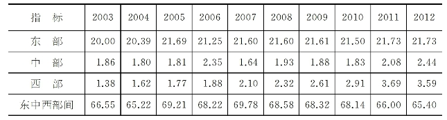 显然,东中西部之间的财政收入差异对总体差异的贡献率最大,从2003—2012年基本维持在67%左右,但是呈现出下降趋势,说明东中西部间财政收入差异对总体差异的贡献越来越小。其次是东部,它对区域间总体财政收入差异的贡献率为21%左右,而中部和西部的贡献率尽管在逐年增加,但直到2012年两者的贡献率相加还不到7%。