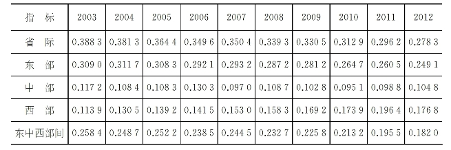 根据公式(3.1),我们计算了2003—2012年各省之间、东中西三大区域内部以及三大区域间的人均财政收入基尼系数。