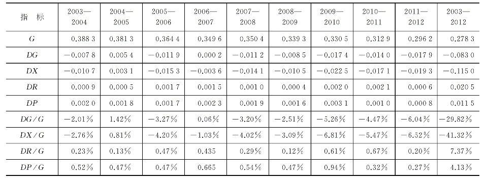 根据式(4.1),我们将2003—2012年各年度省际财政收入基尼系数的变化(DG)按照各省、直辖市、自治区财政收入水平变化(DX)、地区排序变化(DR)和人口份额变化(DP)进行分解(见表4.1)。其中,G表示基期的省际财政收入基尼系数。
