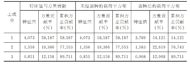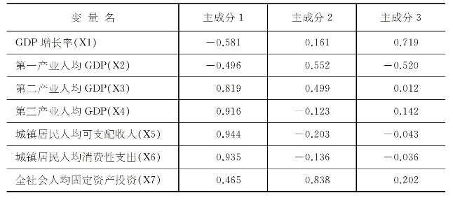 为第j个指标的平均值,σj为第j个指标的总体标准差)将数据进行无量纲化处理后,运用SPSS软件对区域财政收入差异进行分析。输出的KMO统计量大于0.6,Bartlett球形检验的P值接近0,表明这7个指标数据适宜作主成分分析。SPSS输出结果如表5.1、表5.2所示。表5.1中,前3个主成分的累计方差贡献率为89.711%,高于85%,表明这3个主成分已经包含了大部分的数据信息,因此选择前3个主成分作进一步分析。