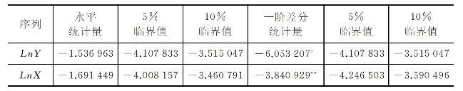 LnY和LnX两个时间序列是一阶单整的,便可以进一步判断区域间营业税收入基尼系数和房地产及建筑业营业税收入之间是否存在长期协整关系。