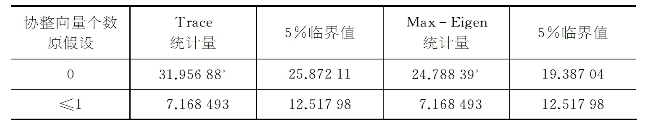 注:*表示在5%显著性水平下拒绝原假设;趋势假设:时间序列数据存在线性确定性趋势,协整等式包含截距项和趋势项;滞后间隔:1到1。