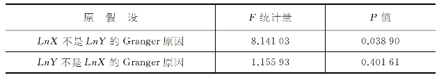 上式反映了2000—2011年间中国区域间营业税基尼系数与房地产及建筑业营业税收入的均衡关系,括号里为t统计量。据此可知,当房地产及建筑业营业税收入增加1个百分点,区域间营业税收入基尼系数将增加0.335 7个百分点。可见,房地产及建筑业对区域间营业税收入差异的影响非常显著。由于本书只须探究二者之间的长期关系,因此不再讨论短期调整的误差修正模型(ECM)。下面对二者关系进行格兰杰因果检验。