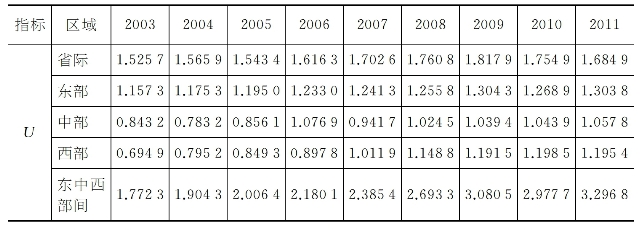 从表6.4可以看出,2003年到2011年,转移支付对缩小区域财政收入差异起到了较明显的调节作用。系数U呈不断扩大趋势,说明效果越来越好。首先,转移支付大大缩小了东中西部间的财政收入差异,效果系数从2003年的1.772 3增加到2011年的3.296 8,增加了近1倍。这主要是由于从1999年提出西部大开发以来,我国的区域经济政策从原来的促进东部倾斜发展转变为促进各区域协调发展,而财政支持是其中一个重要部分,对落后地区转移支付的增加必然带来东中西部间财政收入差异的缩小。转移支付对省际财政收入差异的调节效果较前者小,但每年效果系数都在1.5以上,并且从2003年的1.525 7增加到2011年的1.684 9,呈现出缓慢增加的趋势。转移支付对东部财政收入差异的调节效果变化较为平缓,年均增长率为1.5%,从绝对值比较,均高于中部和西部的调节效果。1978年以来,东部一直是我国政策扶持的重点区域,经过二十多年的发展,内部差异逐渐缩小,转移支付效果的变化越来越小是可以预见的。相较于中西部,东部的财政收入差异更大,但适当的转移支付对差异的调节效果却更为显著。从2006—2011年,中部的转移支付效果系数接近于1,说明转移支付对中部的财政收入差异几乎没有影响,而在此之前,效果系数都小于1,可见转移支付的调节作用是逆向的。2007年之前,转移支付反而加大了西部的财政收入差异,可以看出,在西部大开发前期,尽管中央对西部落后地区拨付了大量转移支付,但由于西部各省的区域差异较大,且西部地区整体平均税负较高,而税收返还在转移支付中的比重很大,导致转移支付的实际效果与预期相反。