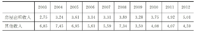 根据表7.2,2003—2012年各项主营业务收入的区域差异都比较显著,但都呈现出下降的态势。到2012年,房屋出租收入的区域差异最大,基尼系数达到0.534 3,这主要与地区经济发展程度、房地产市场供求关系和人均收入等有关。基尼系数达到0.4以上的还有土地转让收入。土地转让收入的区域差异与土地价格的地域性和供求特点有直接关系。商品房销售收入的区域差异相对较小,为0.225 9。虽然我们能够从表7.2获知房地产业各项主营业务收入的区域差异程度,但是要了解各收入来源对总体差异的贡献,还要考虑该项收入占总体收入的比重。因此,我们计算了各项主营业务收入对总体差异的贡献率(见表7.3)。很明显,商品房销售收入的区域差异对总体差异的贡献率最大,历年都超过85%,远远高于其他各项收入。