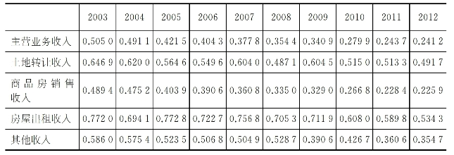 表7.2 2003—2012年区域间房地产业主营业务收入及其分项收入的基尼系数