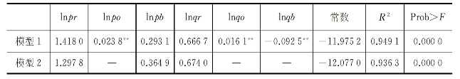 我们首先将住宅销售价格(pr)、办公楼销售价格(po)、商业营业用房销售价格(pb)、住宅销售面积(qr)、办公楼销售面积(qo)以及商业营业用房销售面积(qb)的对数作为解释变量进入模型1(见表7.4)。回归步骤如下: