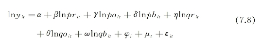 式(7.8)中,yit、prit、poit、pbit、qrit、qoit和qbit分别表示第i个地区t年的房地产业营业税、住宅销售价格、办公楼销售价格、商业营业用房销售价格、住宅销售面积、办公楼销售面积和商业营业用房销售面积。φi为个体效应,μt为时间效应,εit为随机扰动项。需要说明的是,2003—2012年西藏缺少9个商品房价格数据和7个销售面积数据。但是,运用Stata软件对面板模型的截面变量和时间变量进行定义时,结果显示面板数据为强平衡,因此缺失的数据并不影响我们接下来的模型估计。另外,我们的面板数据是短面板,即时间维度T小于截面(个体)维度I,每个个体的信息较少,可以不考虑扰动项εit是否存在自相关,一般假定扰动项独立同分布。所以,构建短面板模型的关键在于解决异方差性。