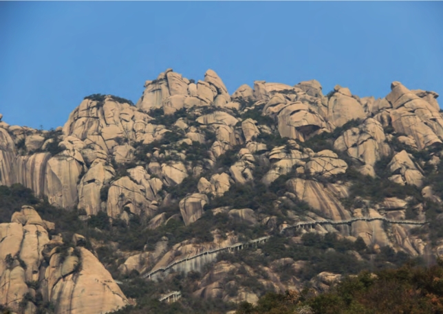 看那石人峰,酷似人形,高耸120余米,犹如伟大的守护神守卫着灵山,已成为迎福消灾、舍生取义、正义之士的化身;再看老子峰,慈眉善目,和蔼端庄,其额头高耸云端,脸庞方正,耳大垂肩,长须飘飘,仿佛老子坐而论道;在老子峰顶,有一块巨石矗立在山顶,犹如一只披着厚厚龟甲的万年神龟,正在仰望着天空中的明月,静心吸纳天地之灵气;还有那“蛤蟆观天”,酷似一只想吃天鹅肉的癞蛤蟆,张着大嘴,傻傻地蹲坐在一块巨大的花岗岩石块上,小心翼翼用目光注视着天空,丝毫不敢懈怠,生怕天鹅从眼前飞走。最让人叹为观止的绝景当属“雄霸天下”,也称华表峰,他鹤立鸡群,一柱擎天,是人类生命的永恒图腾。此外,有以形状得名的“豹子抓鸡”“鹤伴慈云”“九牛峰”“和尚背姑峰”“唐僧师徒取经峰”“兔子峰”“鹰嘴石”“金龟石”等,个个活灵活现、栩栩如生,让人们惊叹于大自然的鬼斧神工。