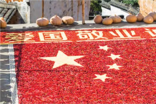 深秋的篁岭,天高云淡,秋风送爽。阳光把晒楼唤醒,家家户户齐刷刷开始“晒秋”,地里种的、山上长的、树上摘的,黄菊、豆角、茄子、苞米、黄豆、芝麻、番薯、油茶籽,一起恣肆地铺在晒架上。但也有有心人家,在大大的晒盘上,用鲜红的辣椒、橙黄的稻谷拼成巨幅国旗,与别样的古民居交相辉映,煞是喜庆。这“晒秋人家”的原创景象,加上梯田花海,就是一场宏大的多彩视觉盛宴,撩人心魄。