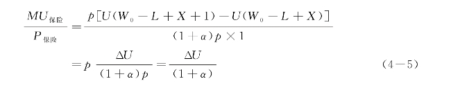 事实上,真要是出险了,当初1元钱保费换来的赔付肯定不止1元钱,而是远超1元钱,而且,出险概率p越低,换来的赔付额越高,也就是说,如果不考虑概率,1元钱保费换来的收入效用是大幅跳升的[6]。但是,保险赔付是以出险概率p发生的,因此,1元钱保费换来的效用,要在赔付带来的收入效用基础上乘以p。所以,式(4-5)中的其实就是1元钱保费换来的赔付的收入效用[7],在此基础上乘以p,就得到1元钱保费带来的保险效用。结果是,分子和分母中的p约掉后,单位支出的保险边际效用就变成了