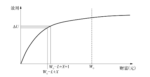 ΔU表示1元钱赔付带来的收入效用。ΔU的大小与U(W)、W0、L和X有关,在U(W)满足边际效用递减、W0和L已知的条件下,ΔU是X的减函数,X越大,ΔU越小。