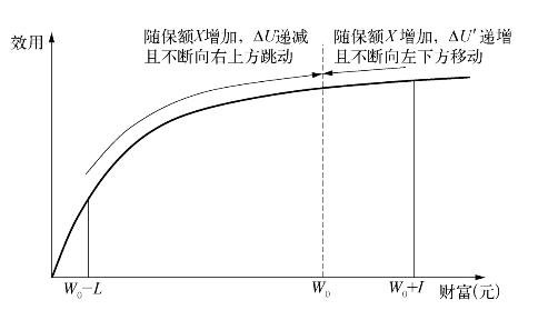 那么,消费者会购买多少保险呢?其实,在效用函数U(W)、W0和L已知的条件下,ΔU和ΔU′都是保额X的函数,而且,ΔU是X的减函数,ΔU′是X的增函数。