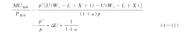 从边际效用均衡模型来看,如果客观出险概率为p,消费者的主观出险概率为p′,则多花1元钱购买保险带来的边际效用就从式(4-5)变为式(4-11)。
