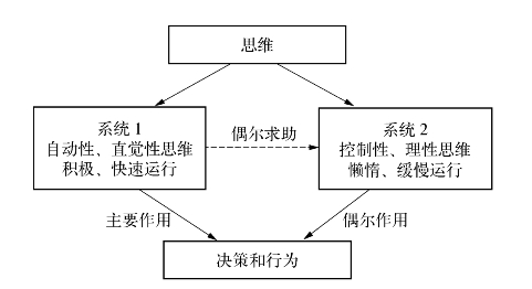 而人类的思维过程可以简化为两种基本类型:自动性(automatic)思维和控制性(controlled)思维,分别对应前面提及的系统1(直觉思维系统)和系统2(理性思维系统)。两类思维过程或两套思维系统的运作模式是:当我们处于清醒状态时,系统1会不间断地自主运行,而系统2则处于散漫的放松状态。系统1会不断为系统2提供印象、直觉、意向和感觉等信息,如果系统2接收了这些信息,就会将印象、直觉等转变为信念,将冲动转化为行为。通常情况下,系统2比较散漫,它会毫无保留或稍微调整后接受系统1的建议。只有当系统1的运行遇到阻碍时,才会向系统2寻求支持。[4]